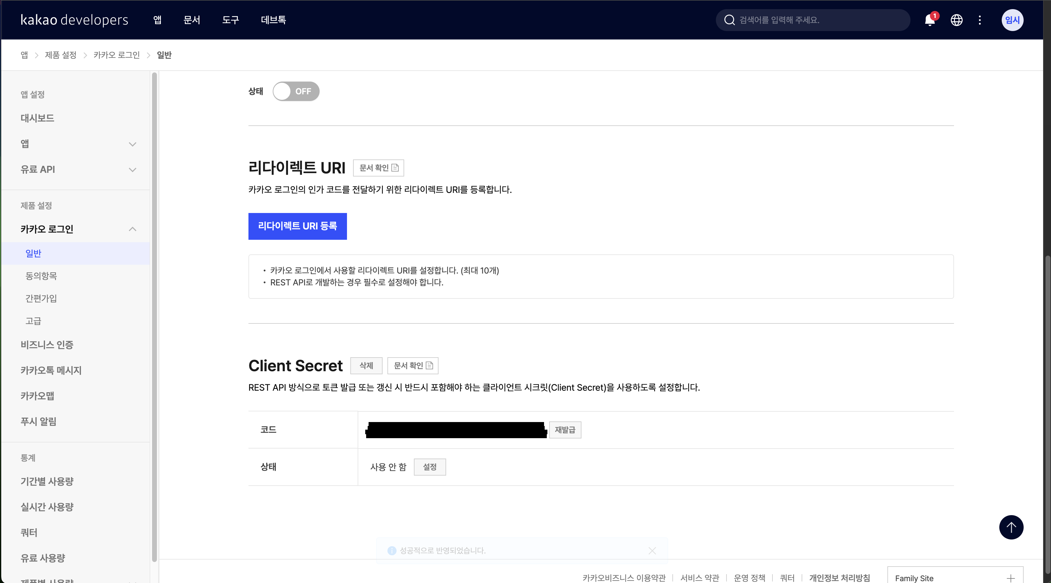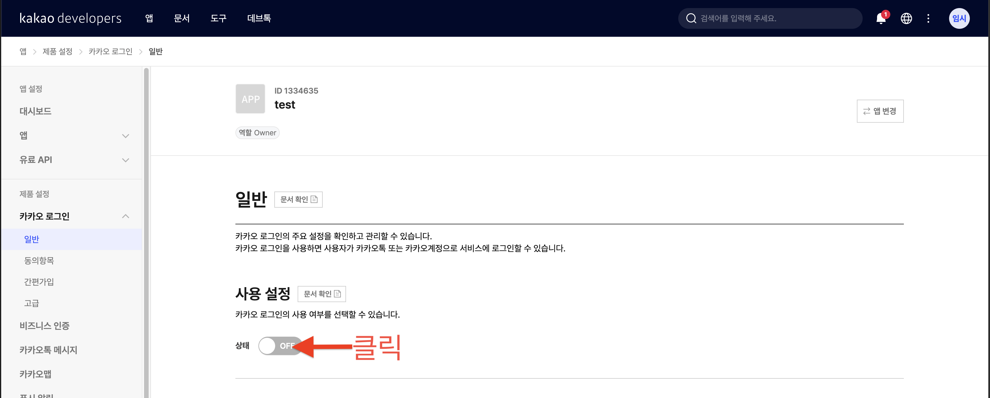 - 카카오로그인 -> 일반에서 사용 설정을 클리한다