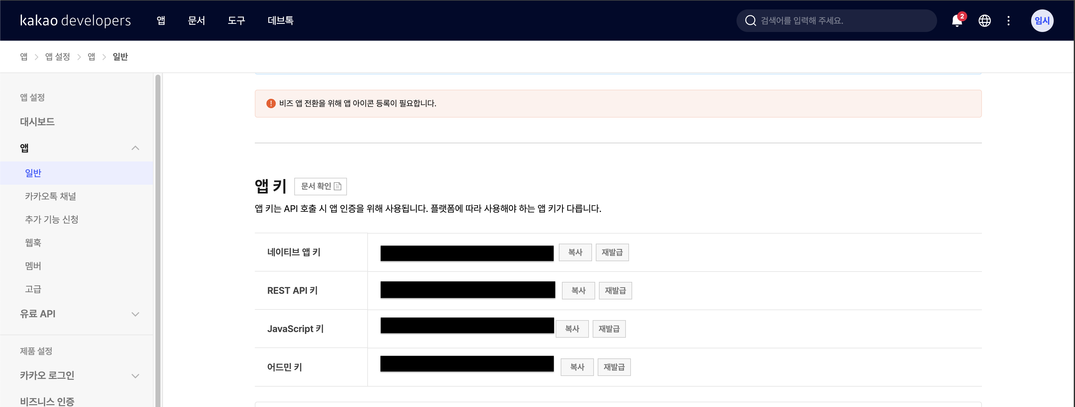 이제 앱 생성이 완료되었다면 카카오 로그인을 활성화할 차례다