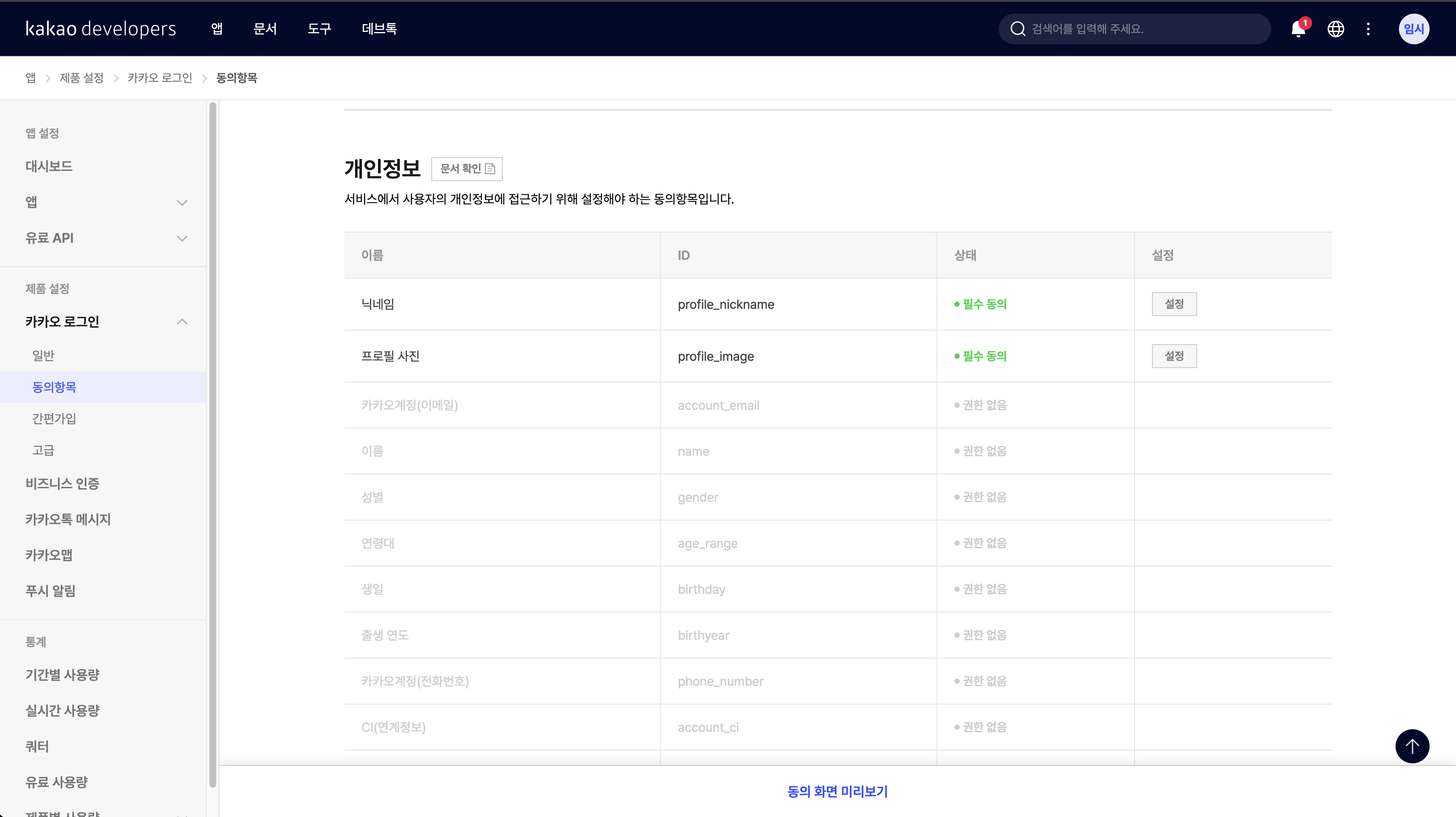 정보제공 동의 화면에서 카카오에서 가져올 정보를 설정할 수 있다. 비활성화된 개인정보의 경우 카카오에 개별로 허가를 받아야 한다.